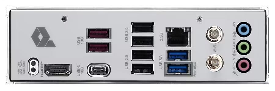 后置接口:1× HDMI 2.1 TMDS、1× USB-C 10Gbps、2× USB-A 10Gbps、2× USB-A 5Gbps、2× USB-A 480Mbps、1× 2.5GbE RJ45、1 对 Wi-Fi 天线插孔、3× 音频插孔。