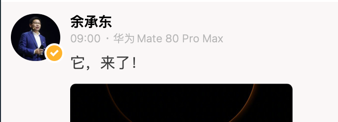 今晨,余承东在微博上更新,公布了华为 2025 年年度旗舰 Mate 80 系列的正式发布会日期:11 月 25 日 14:30——如无意外,这将是今年最后一场主流手机厂商的旗舰机型发布会,多少有些压轴的味道。