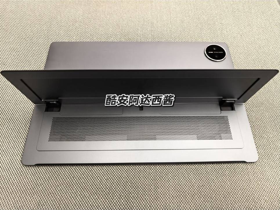 从已经曝光的真机照片上看,MatePad Edge 也将会沿用目前 MatePad 系列产品的圆形镜头 deco,以及一个可以翻开用作支架的散热区域盖板: