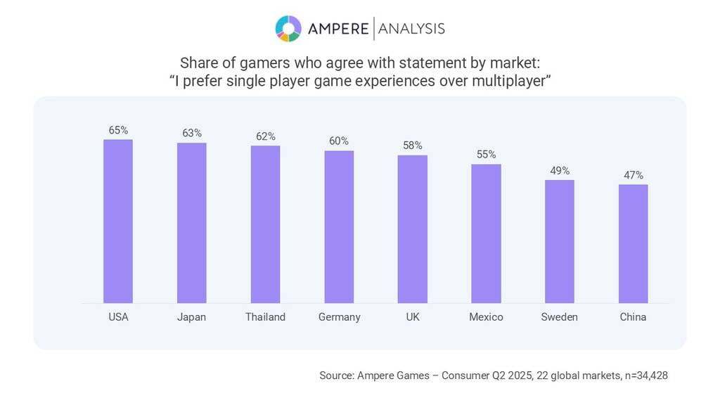 市场研究机构 Ampere Analysis 对 22 个市场的 34,428 名玩家展开调查,结果显示:英国玩家中有 58% 更喜欢玩单人游戏;该比例在日本升至 63%,在美国则进一步攀升至 65%。