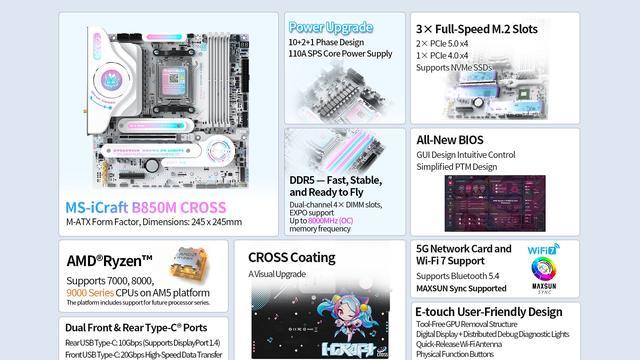 IT之家 11 月 18 日消息,铭瑄近来在中英文官网上线了多款 AMD AM5 主板新品,包括其首款 X870 主板 MS-iCraft X870M 和采用二次元风格设计的 MS-iCraft B850 AIGA、MS-iCraft B850M CROSS,这些主板均在产品介绍中提到了对未来处理器的支持: