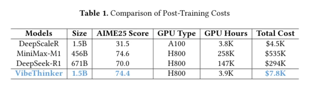 在这样的行业背景下,VibeThinker整个后训练过程(包括SFT和RL阶段)总共只花费了约3900个GPU小时。按照当时的市场租赁价格,总计算成本仅7800美元。