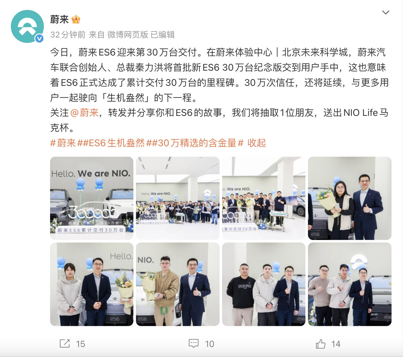 据悉,蔚来ES6于2018年12月发布,在去年5月累计交付量达到20万辆。今年5月,蔚来新ES6汽车上市,整车购买33.8万元起、电池租用方案26.8万元起。