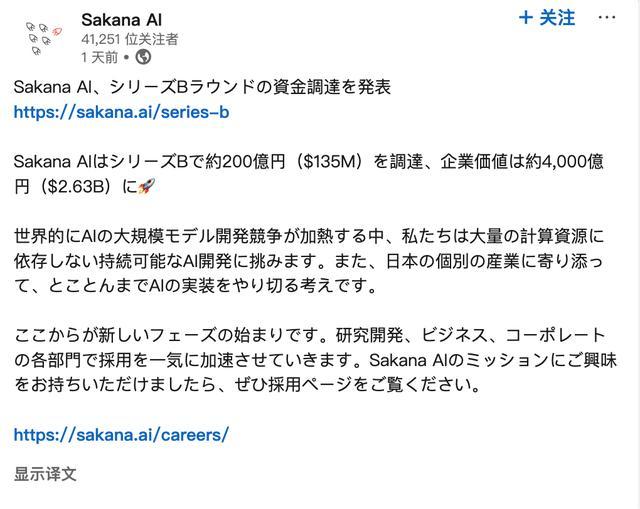 随着新融资的结束,Sakana AI已拿下了3.47亿美元(约合人民币24.7亿元)的融资。Sakana AI此前获得过两轮融资:2024年1月,Sakana AI获得45亿日元(约合人民币2.06亿元)融资,Lux Capital、Khosla Ventures、日本电信公司NTT以及索尼集团参投;去年9月,Sakana AI完成2.14亿美元(约合人民币15.2亿元)A轮融资,英伟达参投成为大股东,使其成立一年估值达到约15亿美元(约合人民币106.7亿元),迅速跃升为独角兽。