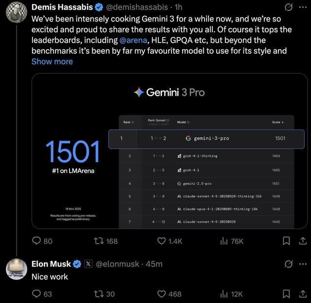 马斯克转发了谷歌DeepMind CEO戴密斯·哈萨比斯(Demis Hassabis)的推文称“干得不错”。