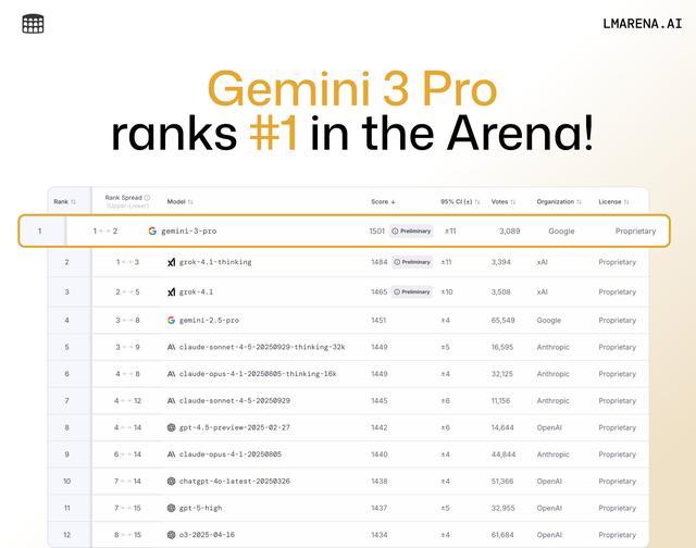 谷歌博客提到,Gemini 3 Pro在一系列基准测试中进行了评估,包括推理、多模态能力、Agent工具使用、多语言性能和长上下文,其在主要的AI基准测试中都远远优于Gemini 2.5 Pro,并以1501 Elo得分位列LMArena大模型竞技场第一。