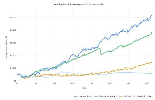 自Gemini 2以来,谷歌Gemini模型已经在Agent方面取得诸多进展,此次Gemini 3还登顶了Vending-Bench 2排行榜。该基准测试通过模拟自动售货机业务运营来考核模型的长期规划能力,其结果显示,Gemini 3 Pro在一整年的模拟运营中,始终保持稳定的工具使用和决策连贯性,既未偏离任务目标,又实现了更高收益。