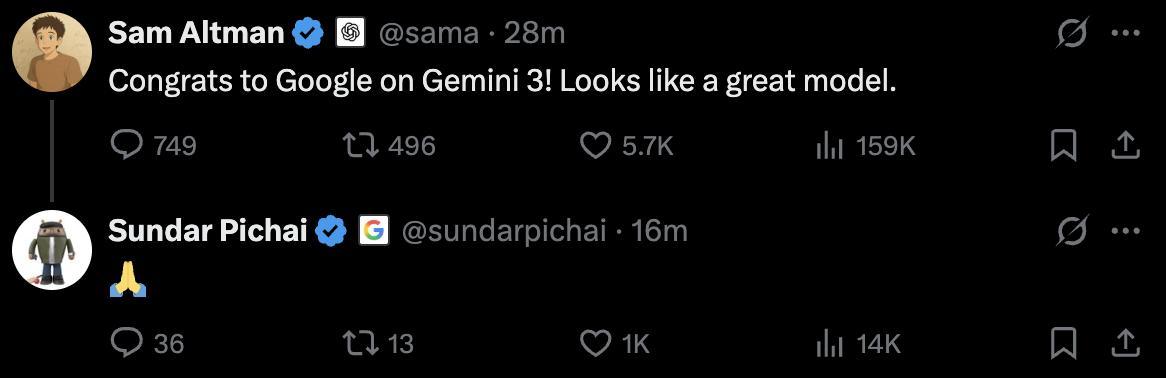 OpenAI联合创始人、CEO萨姆·阿尔特曼(Sam Altman)和xAI创始人、CEO埃隆·马斯克(Elon Musk)纷纷向谷歌发来“贺信”。阿尔特曼发推评价“Gemini 3看起来很不错”,谷歌CEO桑达尔·皮查伊(Sundar Pichai)用了个表情包回复。