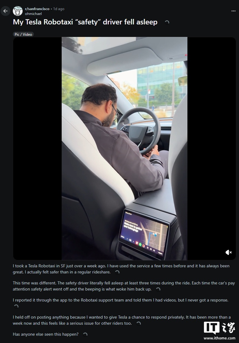 IT之家注意到,该事件被乘客拍摄并上传至 Reddit 平台的“r/sanfrancisco”子版块,发帖用户为 u/ohmichael。该用户表示,此前曾多次在湾区使用特斯拉的网约车服务,整体体验良好。