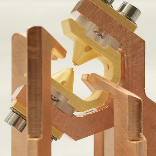 低温离子阱 电极的特写图像。单个离子被捕获在电极之间的空间中。图源:Amar Vutha 等