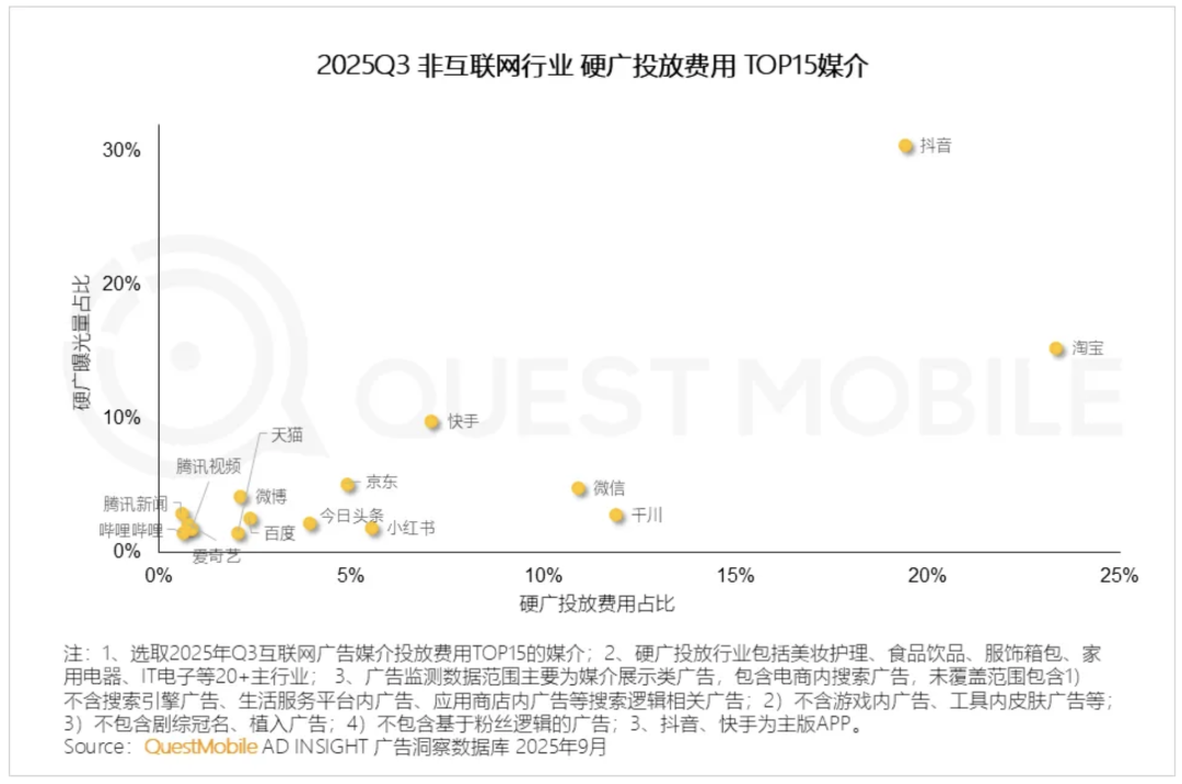 厚此薄彼的趋势之下,短视频+电商+社交三巨头稳固,占据核心广告场景与品牌运营阵地。淘宝、抖音、微信也顺势成为了广告主(包括20+主行业)最爱的前三大硬广投放媒介,而流量与腾讯、阿里持平的百度,则滑落至第九位。
