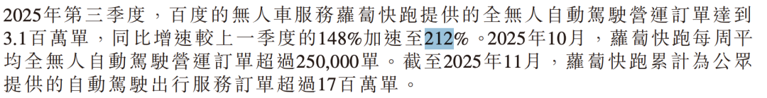 2025年Q3,萝卜快跑提供的全无人自动驾驶订单飙涨到310万单,同比增速较Q2的148%加速至212%。