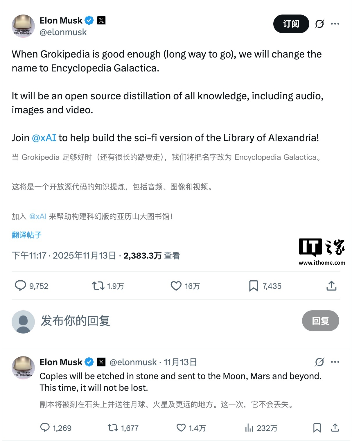 马斯克更称,Grokipedia 像“现代版的亚历山大图书馆”:“亚历山大图书馆被焚毁是人类历史的一大悲剧。为了让知识不再重蹈覆辙,我认为必须把内容刻进石板,用微缩字体保存,并尽可能广泛分发。”