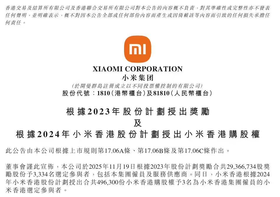 IT之家 11 月 20 日消息,小米集团 11 月 19 日晚发布公告宣布,公司根据 2023 年股份计划奖励合共 29366734 奖励股份予 3334 名选定参与者,包括集团雇员及服务供应商。