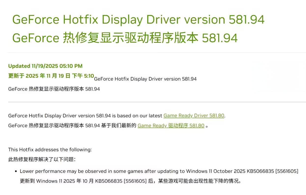 英伟达为彻底解决这一问题,已正式发布了版本号为 581.94 的 GeForce 显示驱动程序。官方表示,安装此版驱动可以修复由 Windows 更新引起的所有潜在性能问题。