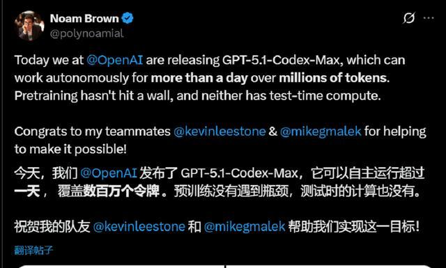 智东西11月20日报道,今天,OpenAI发布了其最新的智能体编程模型GPT‑5.1‑Codex‑Max,这一模型基于OpenAI最新的推理模型打造,专门面向软件工程、研究、数学等复杂任务进行训练。