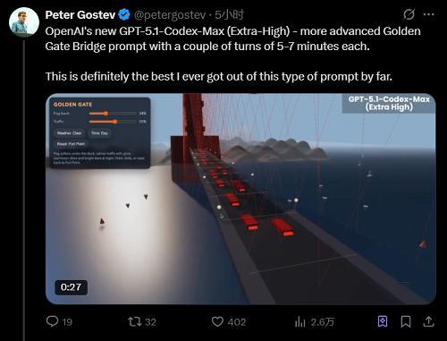 英国定制化贺卡公司Moonpig的AI部门负责人Peter Gostev分享,自己试着让GPT-5.1-Codex-Max打造了一个金门大桥模拟器,他称这绝对是自己从类似提示词中获得的最好的效果。