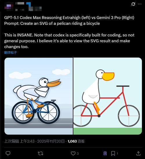 也有不少网友分享了自己的使用体验。这位网友试着让昨天发布的Gemini 3 Pro和GPT-5.1-Codex-Max对决,提示词是创建一个鹈鹕骑自行车的SVG。