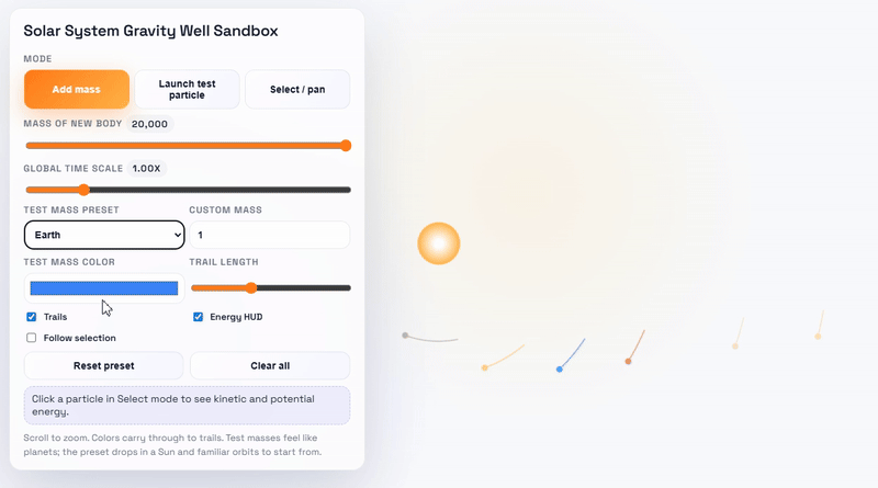 界面提供用于调节中心天体质量与整体时间缩放因子的滑块,允许用户观察同一轨道结构在不同物理条件下的演化过程。