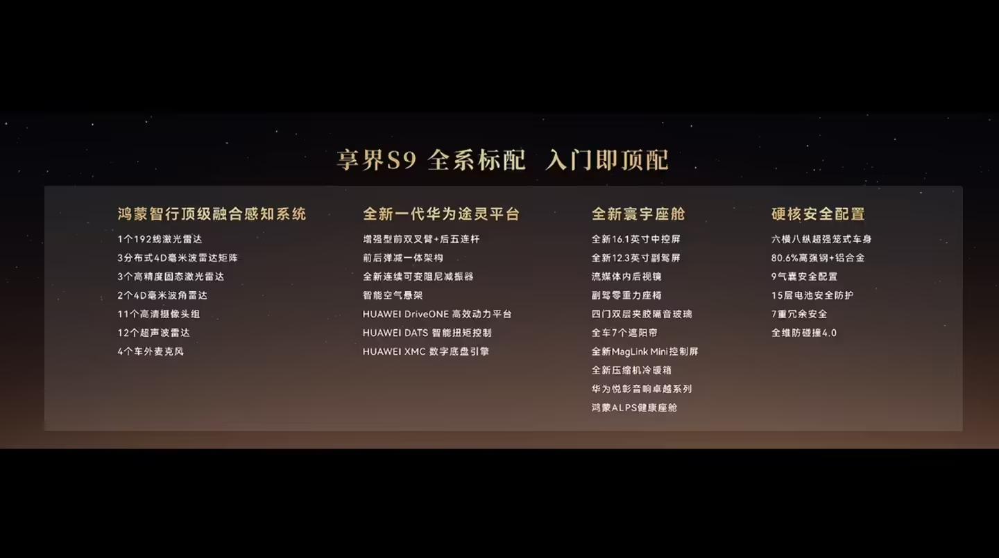 新款享界 S9 搭载全新华为途灵平台,全系标配智能空气悬架和全新连续可变阻尼减振器,升级尊界同源全新六合一全域融合架构,支持连续空间模型构建,实现全维协同控制。该车还拥有 430mm 的涉水性能,100km/h 到 0 制动距离 32.32m,麋鹿测试成绩为 84.1km/h。