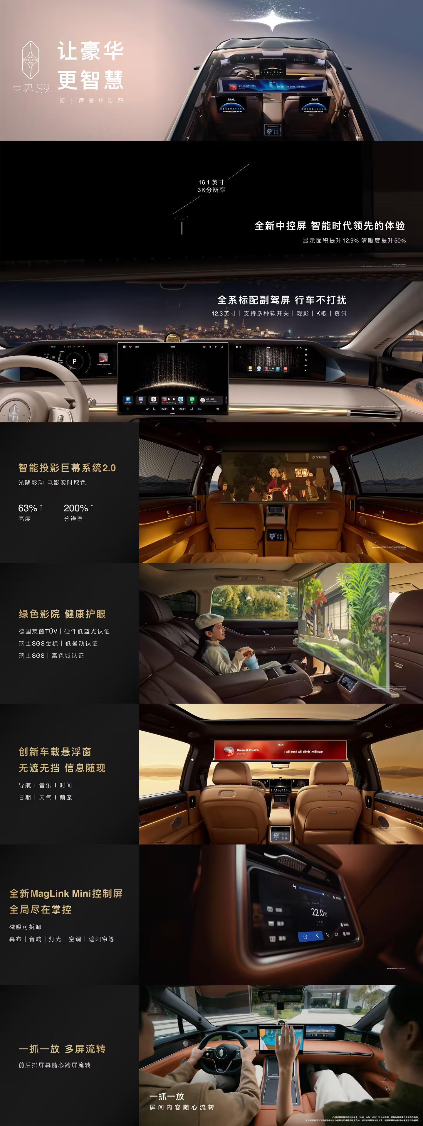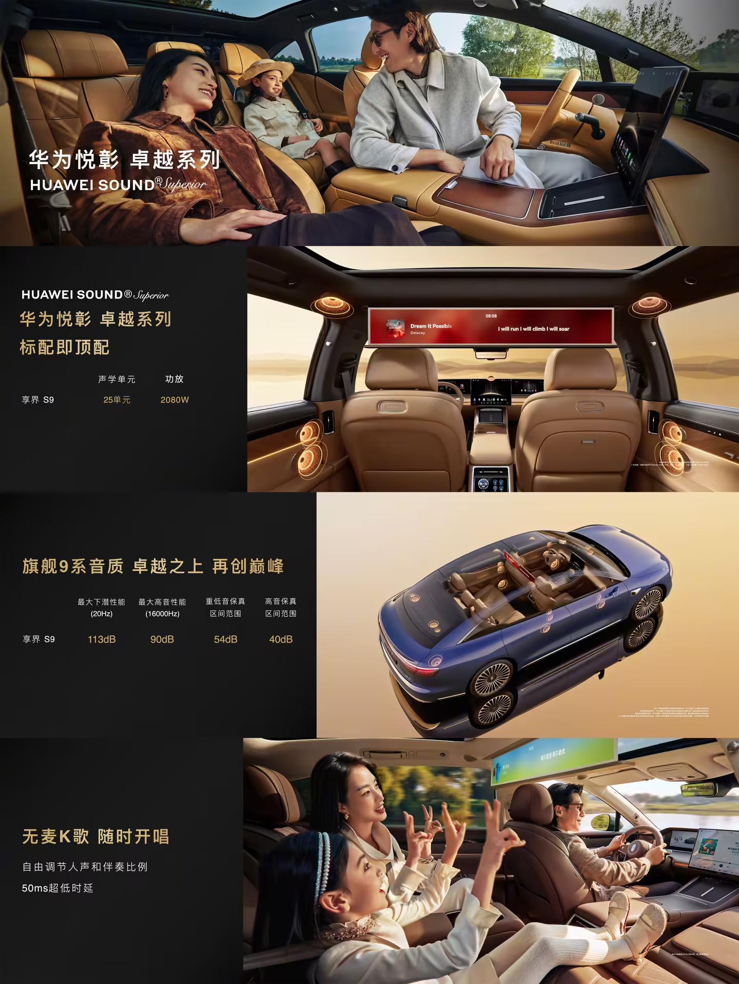 新车标配华为悦彰音响卓越系列,具备 25 声学单元,功放 2080W,号称具备“卓越之上”的音质,支持无麦 K 歌;标配 12.3 英寸副驾屏,配备智能投影巨幕系统 2.0,具备德国莱茵硬件低蓝光等认证。