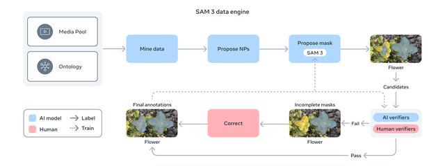 在数据构建方面,SAM 3采用人类与AI协同的数据引擎。这一流程包括使用SAM 3及Llama 3.2v模型自动生成初始分割掩码和标签,再由人类与AI注释者验证和修正。
