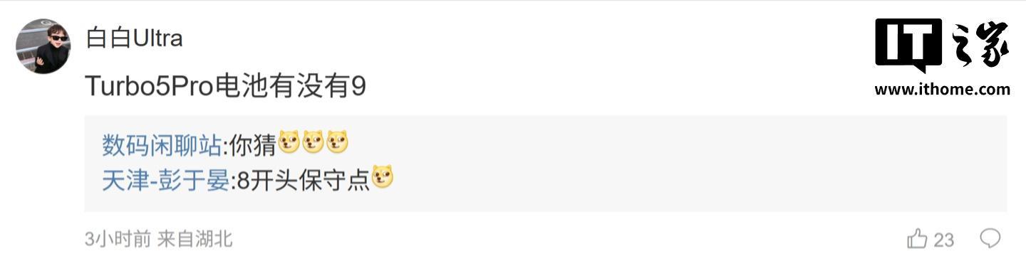 后续有用户在评论区询问:“Turbo5Pro 电池有没有 9”,博主回复道:“你猜”;另一名用户则询问道:“屏幕多大”,博主回复道:“常规大屏,6.7x-6.8x”;而另外一名网友则询问道:“GT2pro 不是说有金属中框吗”,博主则回复道:“有啊,GT 系列定位是中高端,毕竟 8E+8E5 旗舰芯”。