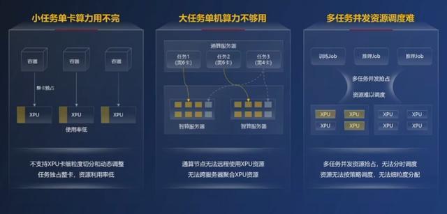 传统容器主要针对CPU、内存等通用计算资源进行管理与调度,而AI大模型训练与推理还需大幅依赖GPU、NPU等智能算力资源,传统容器无法对异构智算资源做到算力细粒度切分与智能调度,导致即使很小的AI工作负载也独占整张算力卡,且无法进行远程调用。