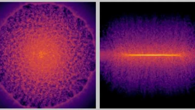 利用深度学习智能体模型模拟 超新星爆发后气体分布的正面和侧面视图。