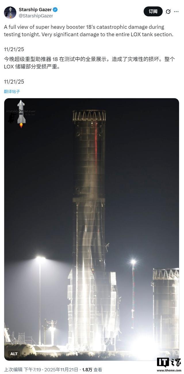 当地时间周五凌晨,SpaceX 的 V3 星舰“Booster 18”第一级在发射前测试中遭遇了某种重大损坏。该公司刚刚将这枚巨大的火箭从工厂中推出,并在社交媒体平台 X 上表示其测试活动开始:“首次操作将测试助推器的重新设计推进系统和其结构强度。”