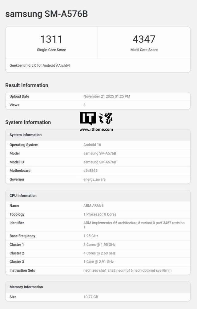 IT之家 11 月 22 日消息,科技媒体 GSMArena 今天(11 月 22 日)发布博文,报道称三星 Galaxy A57 手机现身 GeekBench 跑分库,搭载 Exynos 1680 芯片,配备 12GB 内存,运行安卓 16 系统。