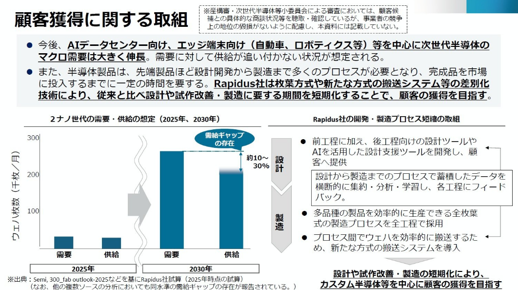 关于客户获取,该公司解释说“客户获取空间巨大”,并指出预计到2030财年,全球2纳米半导体市场的供应将比需求缺口约10%至30%。该公司首先的目标是争取来自为人工智能数据中心设计定制半导体的无晶圆厂公司的订单,然后计划扩大国内外边缘设备(汽车、机器人等)的供应。