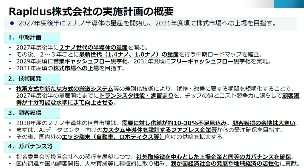 2025年11月21日,经济产业大臣赤泽昭正宣布,政府计划向Rapidus投资1000亿日元。Rapidus的实施计划也于同日公布,计划于2031财年左右上市。