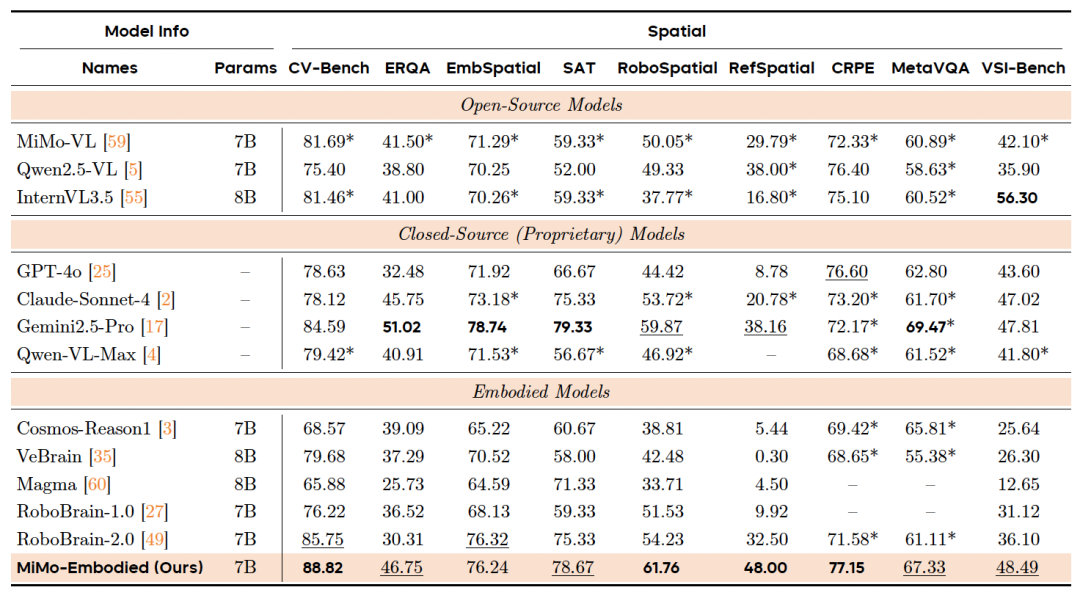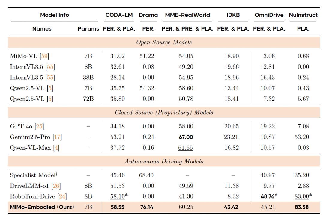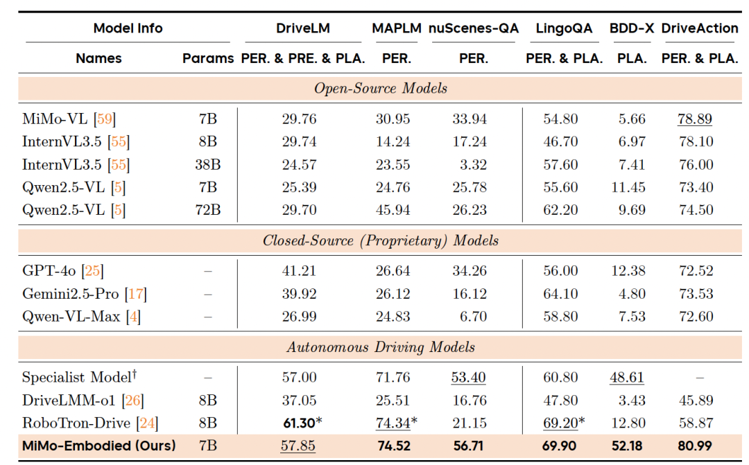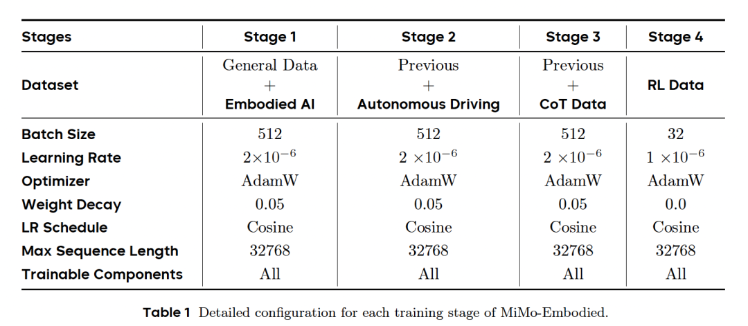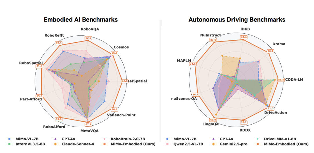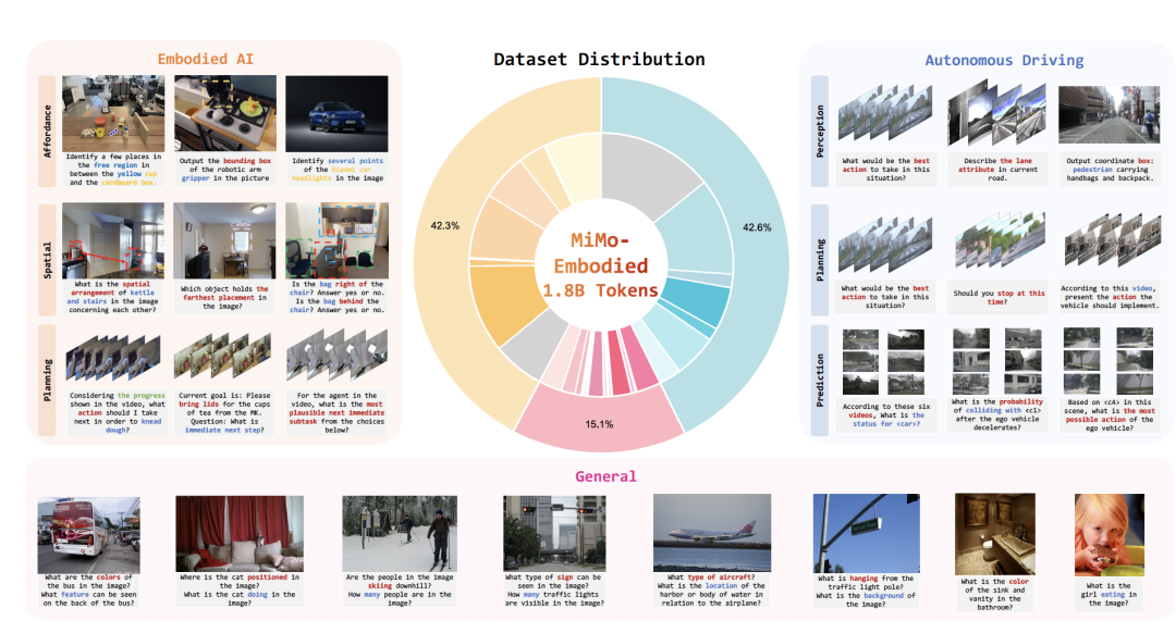 由此,通过无缝集成视觉和文本领域,MiMo-Embodied增强了多样化多模态推理任务和应用的潜力。