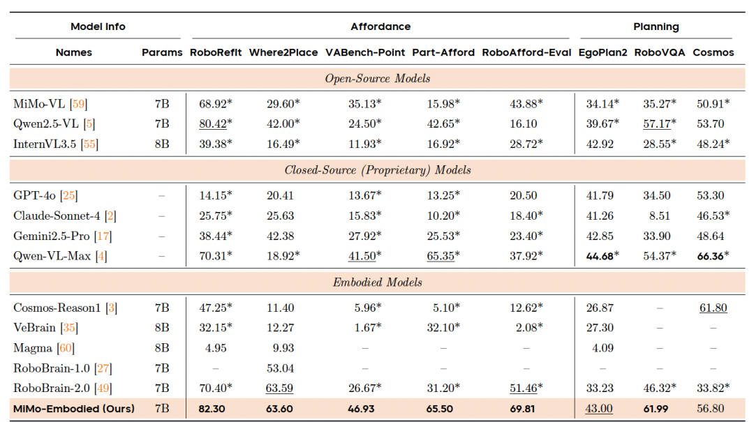 结果表明,MiMo-Embodied 取得了具有竞争力的结果,与通用多模态模型和专用具身模型相比,在可供性预测和空间理解方面表现出特别的优势。