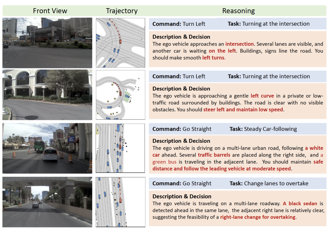 在每种情况下,模型都应感知道路上下文,整合自车状态和导航意图,并做出连贯的决策。