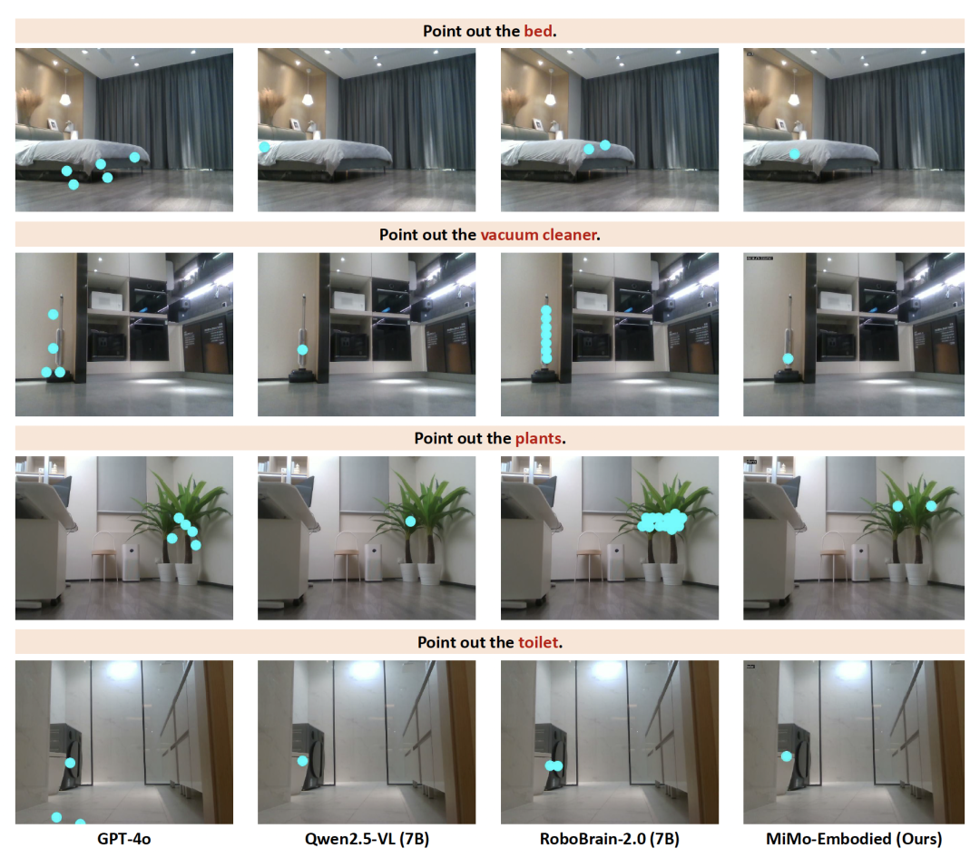 在具身导航中,相较于GPT-4o、Qwen2.5-VL和RoboBrain-2.0,MiMo-Embodied展现出在多样化家庭场景中增强的对象定位能力和一致的性能。