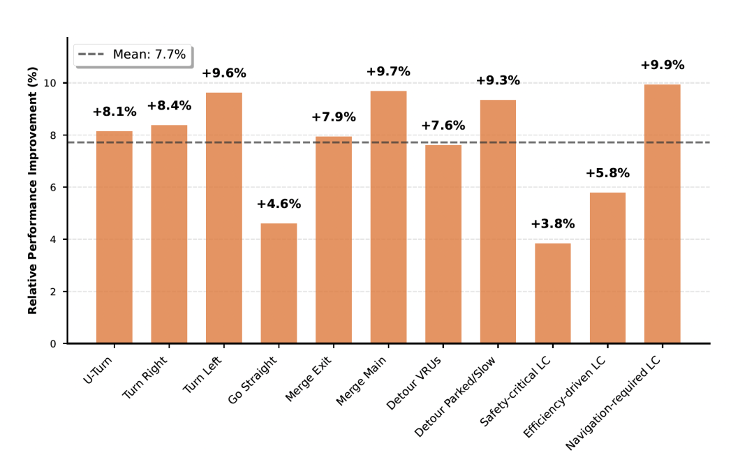 此外,MiMo-Embodied在所有评估类别中始终优于基线。值得注意的是,在转弯、绕开障碍物和变道等复杂、交互式操作中,性能提升最为显著。
