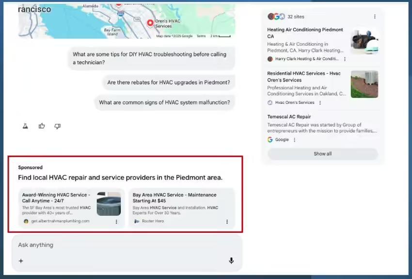 随后,另一位用户布罗迪・克拉克(Brodie Clark)证实,即使在非 Labs 的常规环境中,进行基于服务的查询时也能复现这一情况。这一发现迅速引发了科技圈的关注,标志着此前完全无广告的 AI 搜索体验开始发生改变。