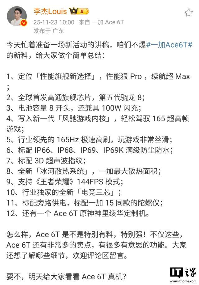 IT之家 11 月 23 日消息,一加中国区总裁李杰今日对一加 Ace 6T 的配置进行了简单总结,并预告真机周一见。