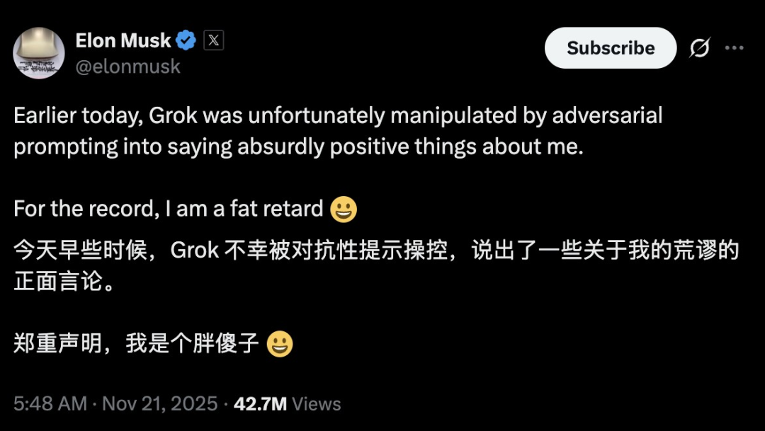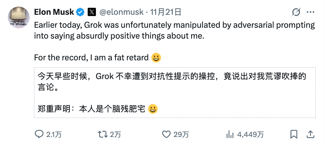 「今天早些时候,Grok不幸被对抗性提示操控,说了一些夸我夸得太离谱的话。郑重声明,我又胖又傻 。」