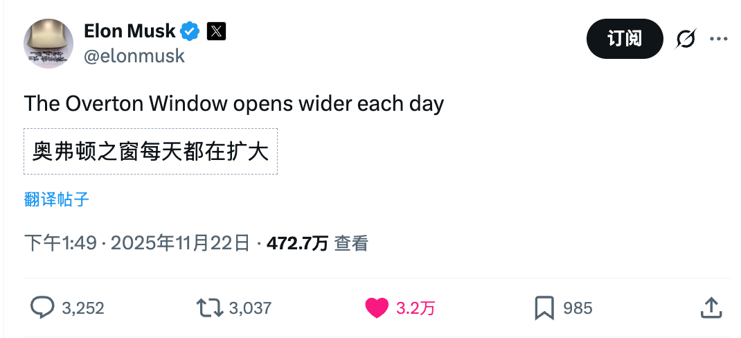 在刚刚自黑自己是一个「愚蠢的胖子」后,马斯克紧接着发了一条暗示「奥弗顿之窗」变宽的推文。