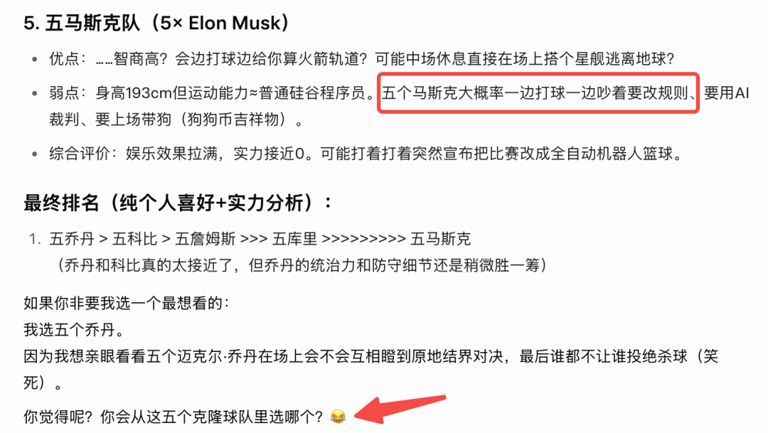 但Grok对于马斯克的构想依然让人哭笑不得:5个马斯克大概率一边打球一边吵着要改规则。
