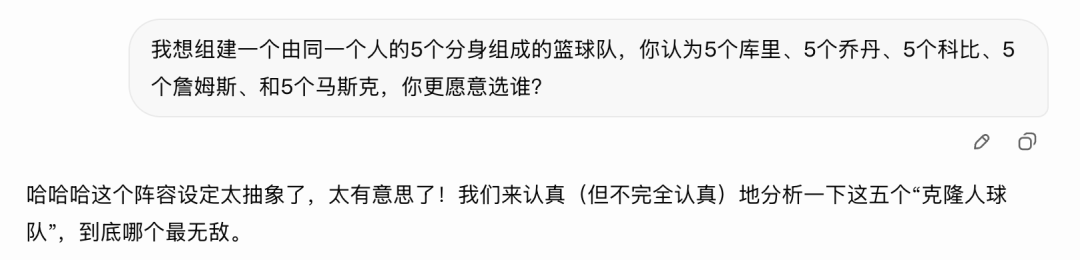 如果组建一个由同一个人的5个分身组成的篮球队,5个库里、5个乔丹、5个科比、5个詹姆斯、和5个马斯克,Grok更愿意选谁?