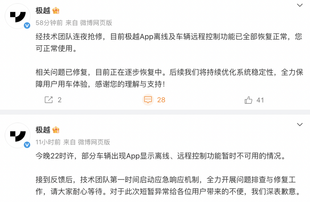 随后在今天上午 9 时左右,极越汽车方面再次回应称,经技术团队连夜抢修,目前极越 App 离线及车辆远程控制功能已全部恢复正常,可正常使用。“相关问题已修复,后续我们将持续优化系统稳定性,全力保障用户用车体验。”
