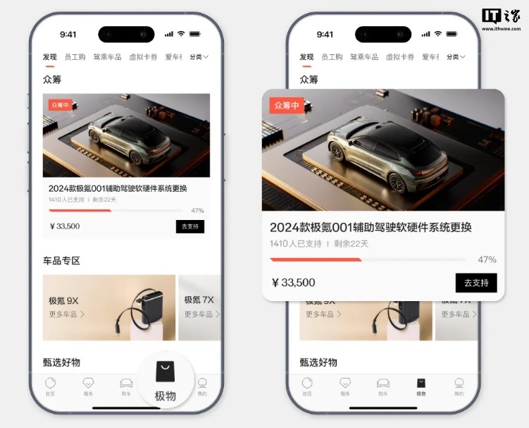 本次众筹以分车型的方式开展,活动结束时参与众筹人数达到目标数量,即可启动对应车型的软硬件系统更换筹备工作。用户可在极氪 App-极物板块-首页众筹-选择对应众筹项目,点击“去支持”即可参与。