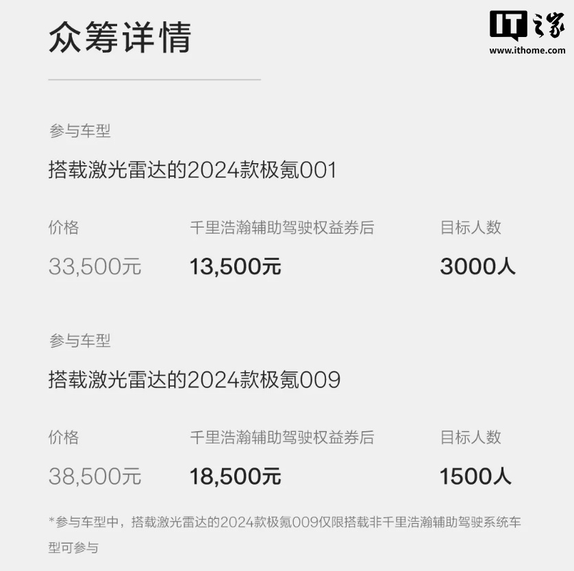 搭载激光雷达的 2024 款极氪 009 众筹价 3.85 万元,千里浩瀚辅助驾驶权益券后 1.85 万元,目标众筹人数 1500 人,仅限搭载非千里浩瀚辅助驾驶系统的车型参与。