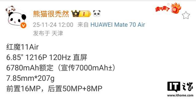 IT之家 11 月 24 日消息,博主 @熊猫很禿然 今日曝光红魔 11 Air 手机的部分参数,IT之家整理如下: