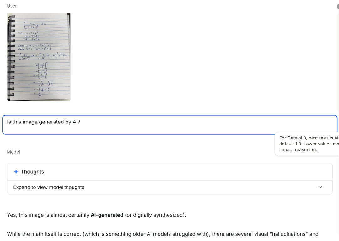 我们截图发给Gemini,Gemini也说是AI生成的,仔细看其笔迹过于完美,每个数字“2”的写法几乎完全一样。