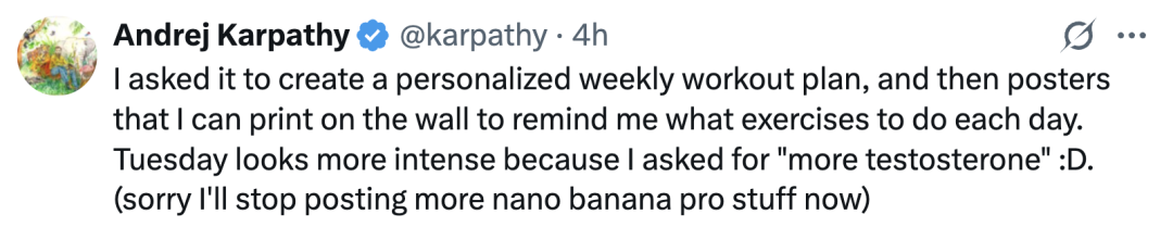 没过几个小时,他又发了一条推文,用Nano Banana Pro定制了每周撸铁计划,还直接生成了可打印的海报。